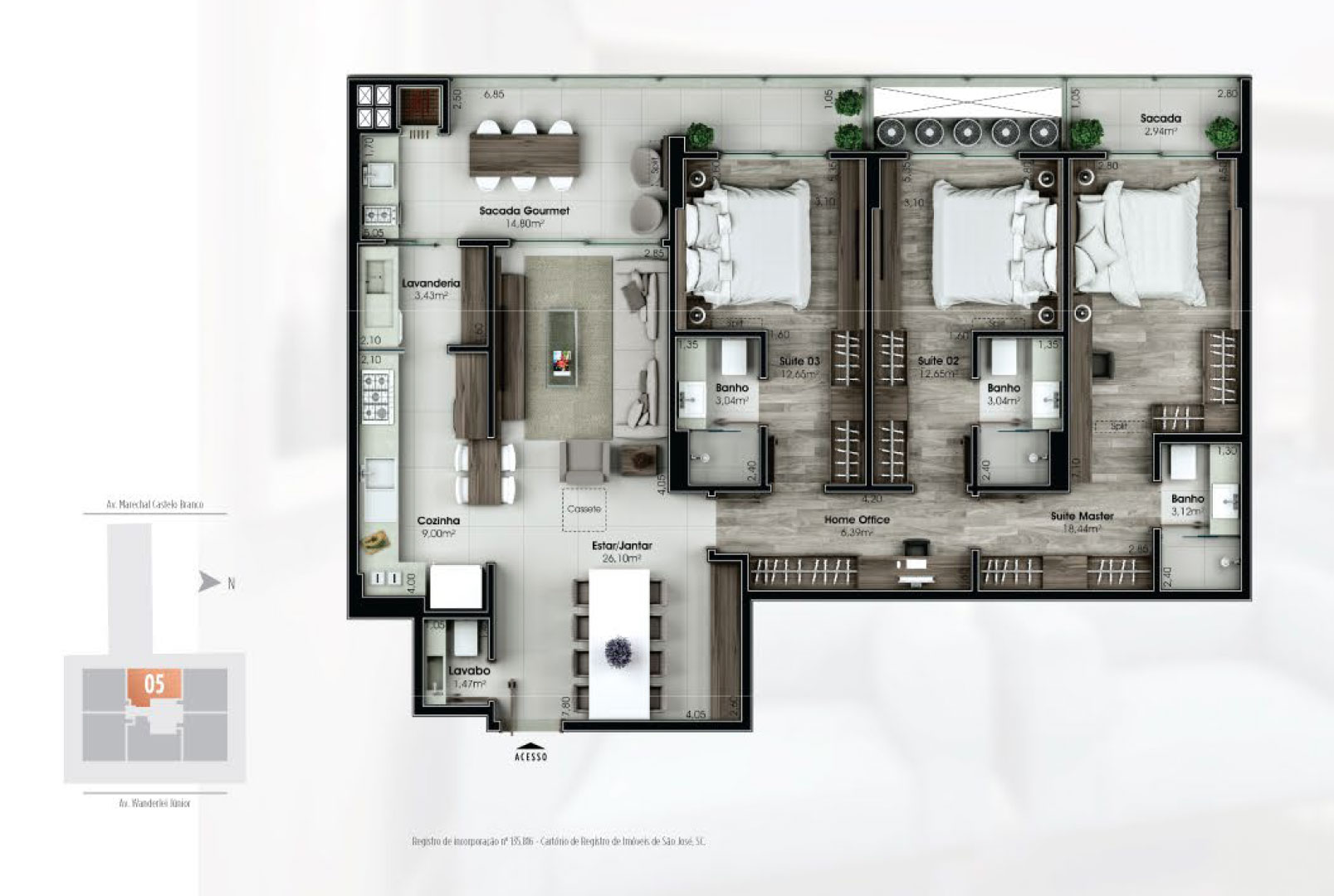 Para quem preza por total conforto, os apartamentos do Absoluto são ideais. As plantas de todos os imóveis contam com três suítes, característica que traz mais privacidade e facilidade para o dia a dia. Outro ponto positivo é o living integrado à sala de jantar, tornando o ambiente ainda mais amplo e confortável.